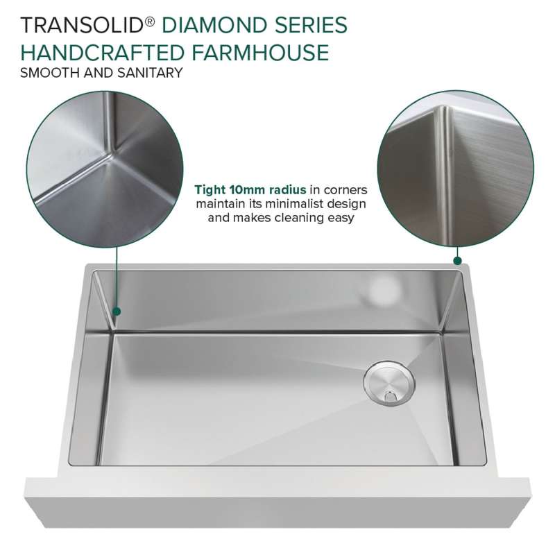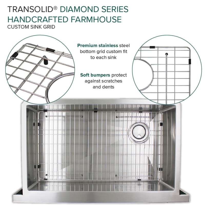 With the Transolid Diamond Sink Collection you can experience the beauty and functionality of a commercial kitchen at a fraction of the cost. Crafted from industrial 304 stainless steel with substantial 16-gauge thickness, which is 2.5 times heavier than similar size sinks available in the market, these luxurious sinks are known for their appeal, durability, and corrosion resistance. The deep 10 in. basins feature channeled grooves along the sink bottom and tight 3/8 in. radius interior corners that work to keep the water moving towards the drain. The underside of the sinks include thick 5 mm sound deadening pads and waterproof undercoating to keep your kitchen quiet and free from unwanted condensation. Included with every Transolid Diamond Sink is a universal sink drain kit with standard 1-1/2 inch pipe fittings, a magnetic accessories kit consisting of a hook, ledge, and sponge holder, which can easily adhere to the side of the sink by applying the included magnetic tape along the underside. A matching stainless steel sink grid with rubber bumpers to keep your sink protected from scratches and a sleek stainless covered flip-top sink strainer are also included. The long-lasting brushed finish sink and included accessories will compliment any kitchen and provide a true sense of culinary excellence. Transolid Diamond Sinks are all backed by a lifetime limited warranty.