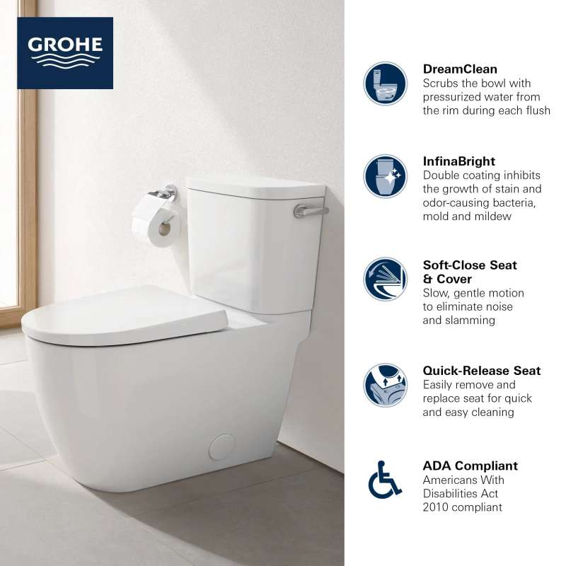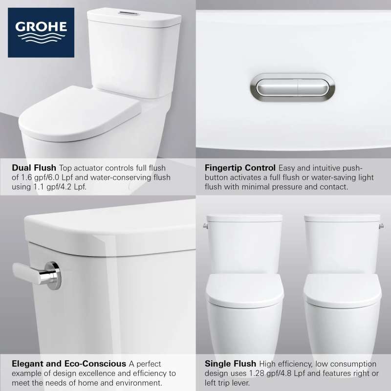 Rarely is something so beautiful equally equipped with impressive power. The GROHE Essence Right Height Elongated Toilet features a powerful flushing system that ensures the bowl is thoroughly cleared and cleaned with every flush. Designed with skirted sides for quick, easy cleaning and a timeless look, it uses just 1.28 gallons of water per flush, making Essence the perfect choice for eco-friendly elegance.