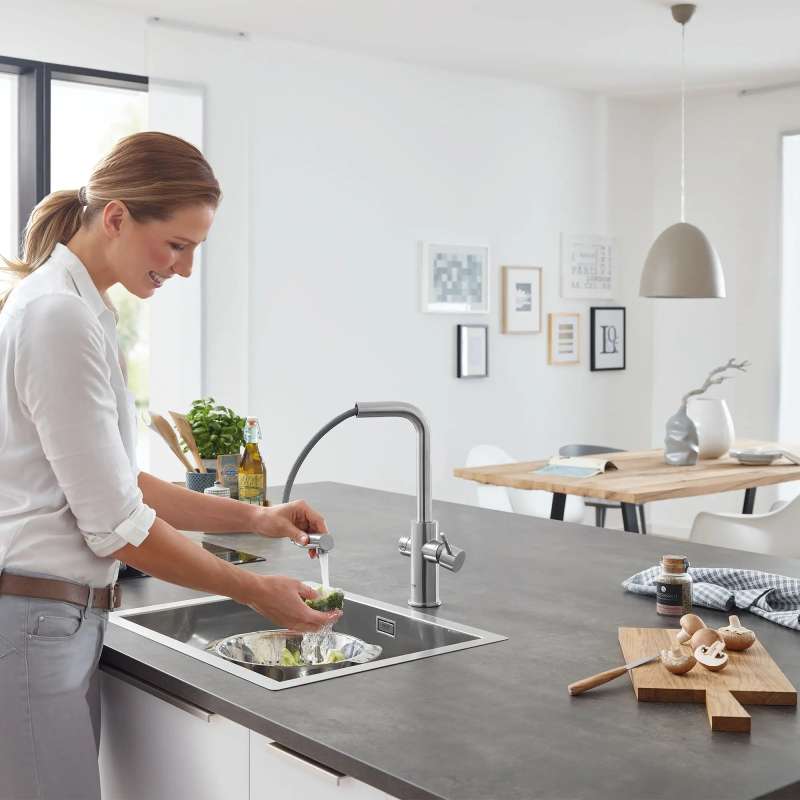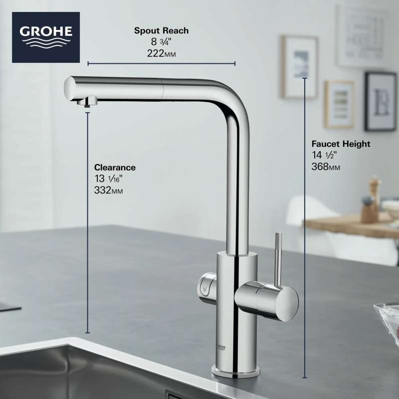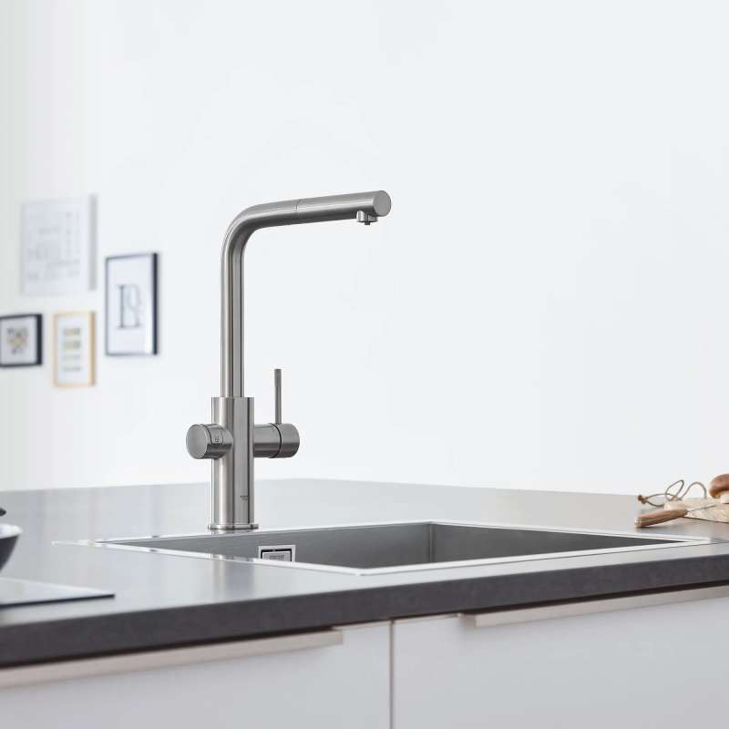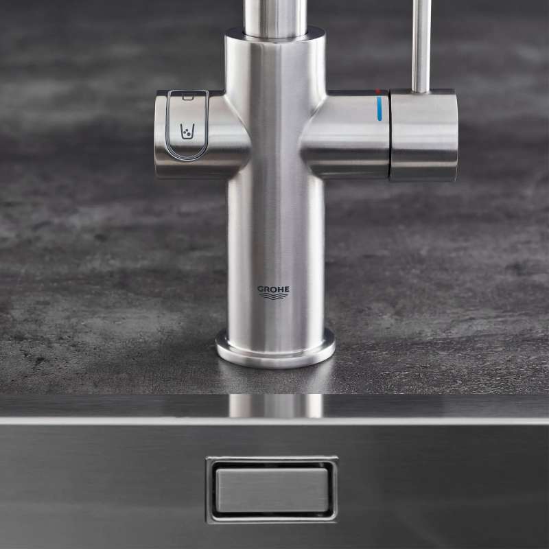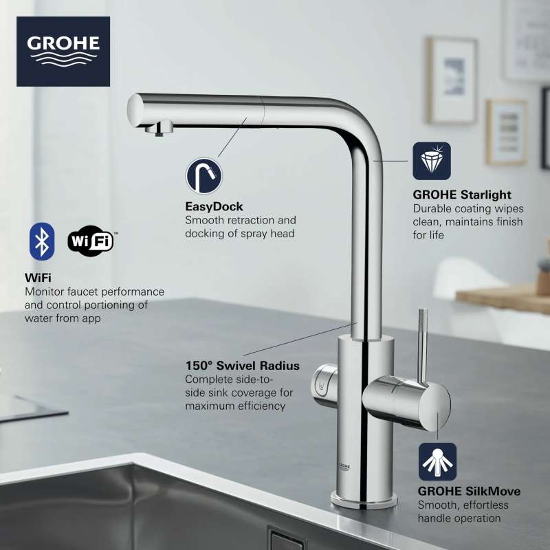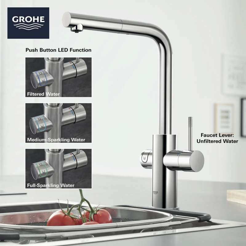 Smart and satisfying, the GROHE Blue Chilled and Sparkling 2.0 Kitchen Faucet gives you instant access to filtered chilled still water, medium carbonated or full sparkling water, and unfiltered tap water in one technologically advanced kitchen faucet. Pushbutton with LED ring dispenses your preferred water while lever handle dispenses tap water. Sleek and modern, the GROHE Blue Chilled and Sparkling 2.0 Faucet is equipped with Wi-Fi and Bluetooth to monitor faucet performance, track and notify you of CO2 usage and filter status, and control water portioning via app. GROHE Blue Filter, CO2 tank and cleaning cartridge sold separately.