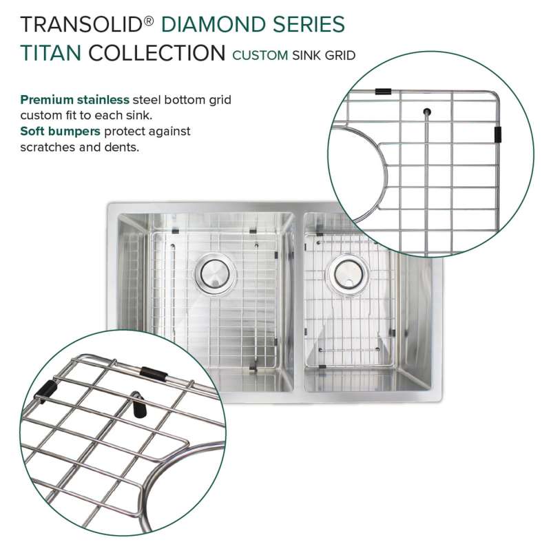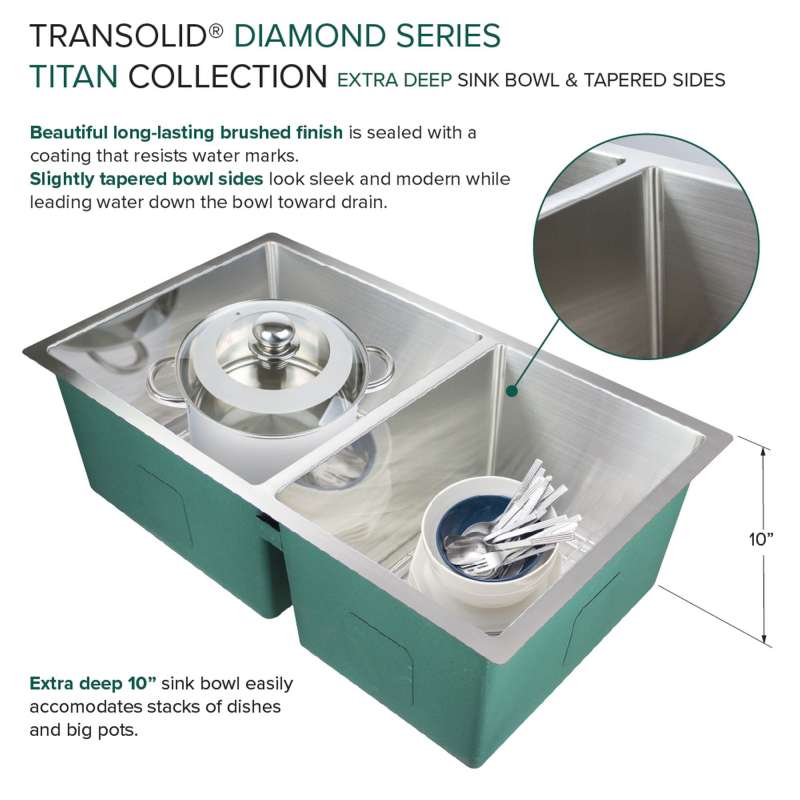 With the Transolid Diamond Sink Collection you can experience the beauty and functionality of a commercial kitchen at a fraction of the cost. Crafted from industrial 304 stainless steel with substantial 16-gauge thickness, which is 2.5 times heavier than similar size sinks available in the market, these luxurious sinks are known for their appeal, durability, and corrosion resistance. The deep 10 in. basins feature channeled grooves along the sink bottom and tight 3/8 in. radius interior corners that work to keep the water moving towards the drain. The underside of the sinks include thick 5 mm sound deadening pads and waterproof undercoating to keep your kitchen quiet and free from unwanted condensation. Included with every Transolid Diamond Sink is a universal sink drain kit with standard 1-1/2 inch pipe fittings, a magnetic accessories kit consisting of a hook, ledge, and sponge holder, which can easily adhere to the side of the sink by applying the included magnetic tape along the underside. A matching stainless steel sink grid with rubber bumpers to keep your sink protected from scratches and a sleek stainless covered flip-top sink strainer are also included. The long-lasting brushed finish sink and included accessories will compliment any kitchen and provide a true sense of culinary excellence. Transolid Diamond Sinks are all backed by a lifetime limited warranty.