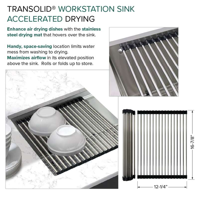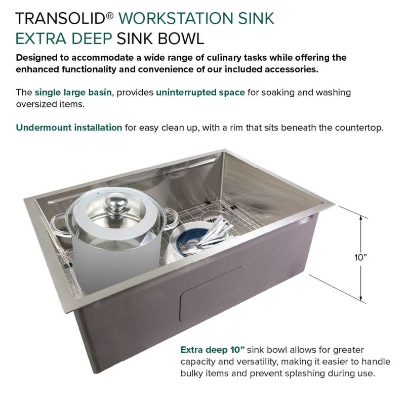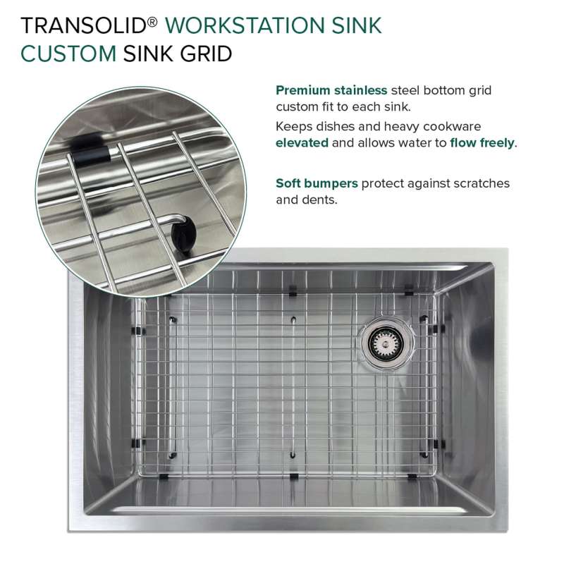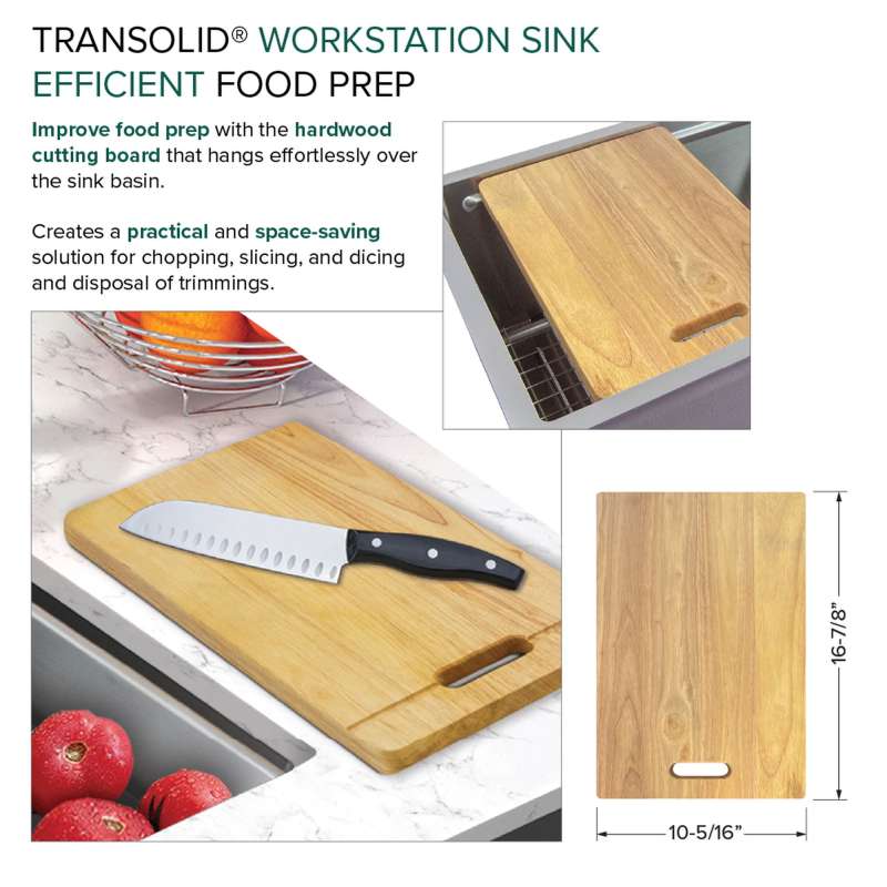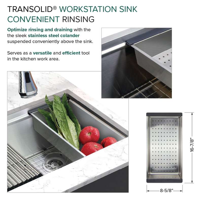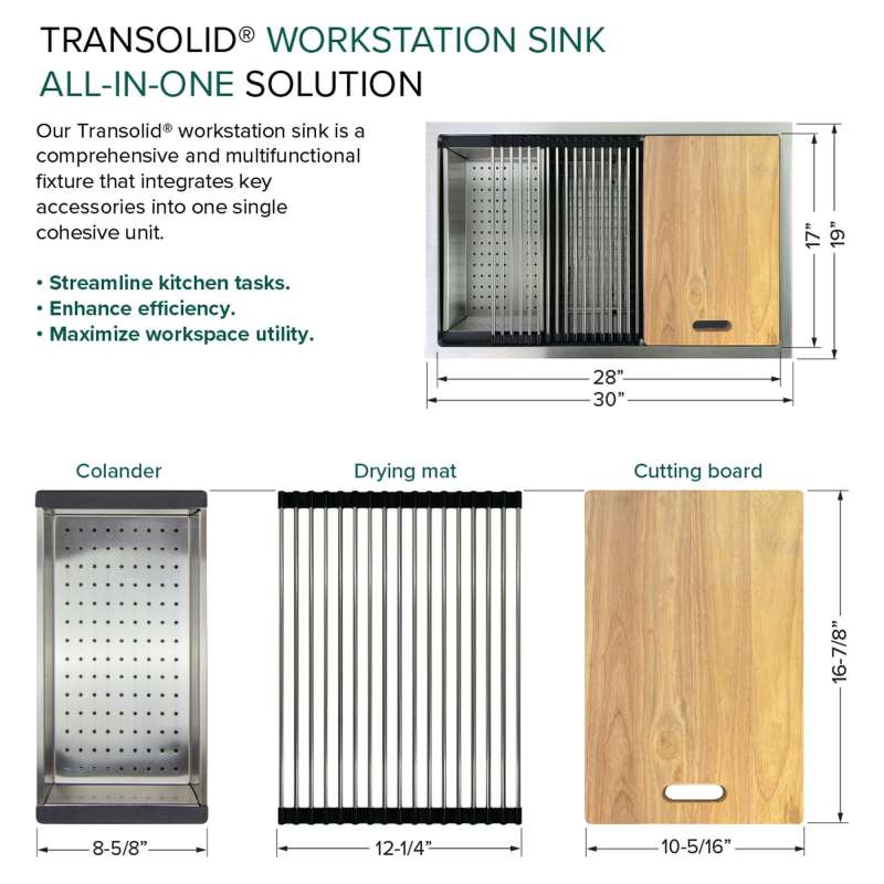 Transolid Kitchen Workstation Sinks redefine culinary convenience. This all-in-one solution includes a sink crafted from 18-gauge 304 stainless steel with a premium brushed finish and custom-fitted accessories. Its clever design optimizes sink space with a ledge for the colander, roller mat, and cutting board. Enjoy a quiet culinary experience thanks to the 5mm sound deadening pads. Let Transolid economically elevate your kitchen with efficiency and style.