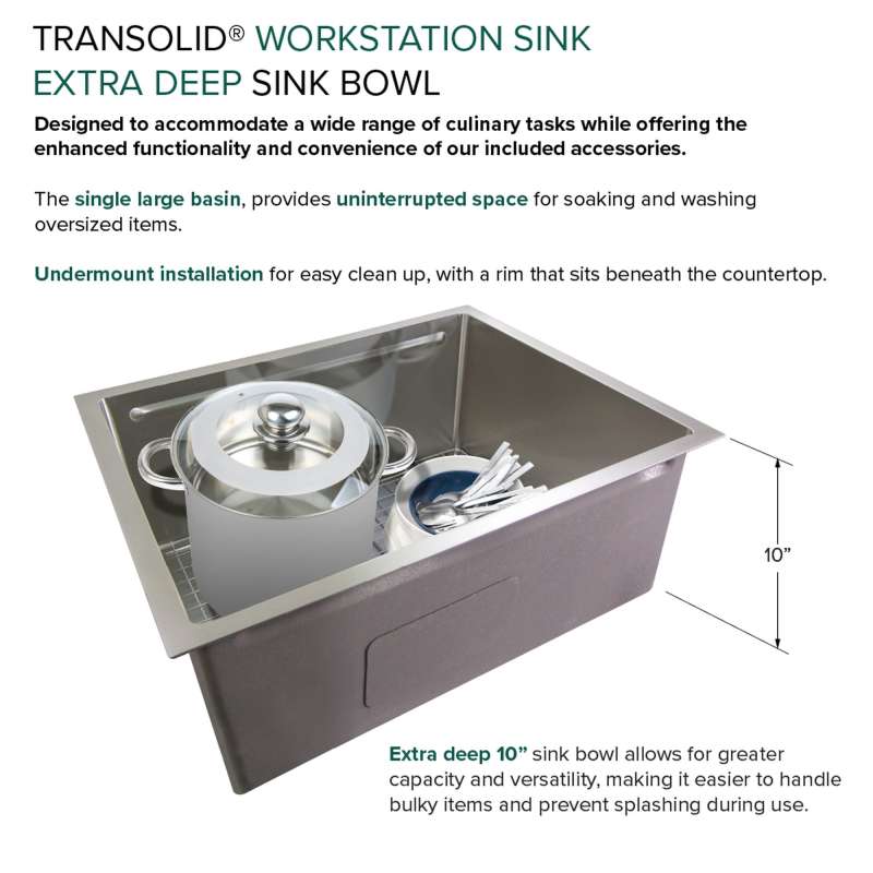 Transolid Kitchen Workstation Sinks redefine culinary convenience. This all-in-one solution includes a sink crafted from 18-gauge 304 stainless steel with a premium brushed finish and custom-fitted accessories. Its clever design optimizes sink space with a ledge for the colander, roller mat, and cutting board. Enjoy a quiet culinary experience thanks to the 5mm sound deadening pads. Let Transolid elevate your kitchen with efficiency and style.