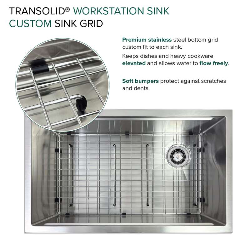 Transolid Kitchen Workstation Sinks redefine culinary convenience. This all-in-one solution includes a sink crafted from 18-gauge 304 stainless steel with a premium brushed finish and custom-fitted accessories. Its clever design optimizes sink space with a ledge for the colander, roller mat, and cutting board. Enjoy a quiet culinary experience thanks to the 5mm sound deadening pads. Let Transolid economically elevate your kitchen with efficiency and style.