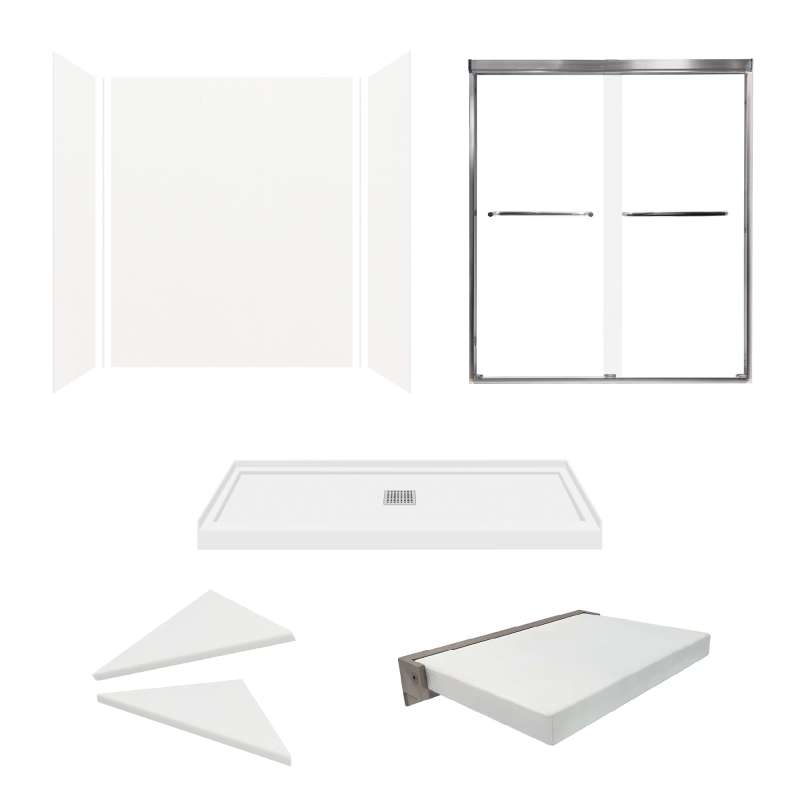 Transform your bathroom into a clean, contemporary retreat with this complete white Expressions shower kit, designed for both style and functionality. The kit includes a sleek frameless bypass shower door for a modern, open feel, a durable shower base for lasting performance, and premium solid surface walls that offer a smooth, easy-to-clean finish with a timeless look. The integrated corner shelf adds smart, space-saving storage for your essentials, while the foldable shower seat provides comfort and convenience without sacrificing space. Crafted in a crisp, white finish, this all-in-one kit blends seamlessly with any decor and brings a spa-like touch to your daily routine. Perfect for both new installations and bathroom remodels, it’s the ideal solution for creating a stylish and efficient shower space.