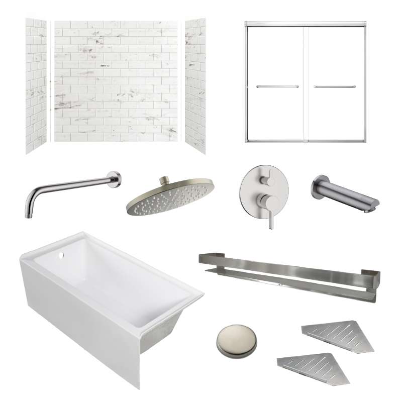 • KIT INCLUDES: 60-in x 36-in x 60-in Shower Wall Kit, 60-in x 36-in x 20-in right-hand Alcove Tub, 60-in x 60-in Shower Door, a pair of 12-1/4-in Corner Shower Shelf, 30-in Grab Bar Shelf and, matching Tub Drain