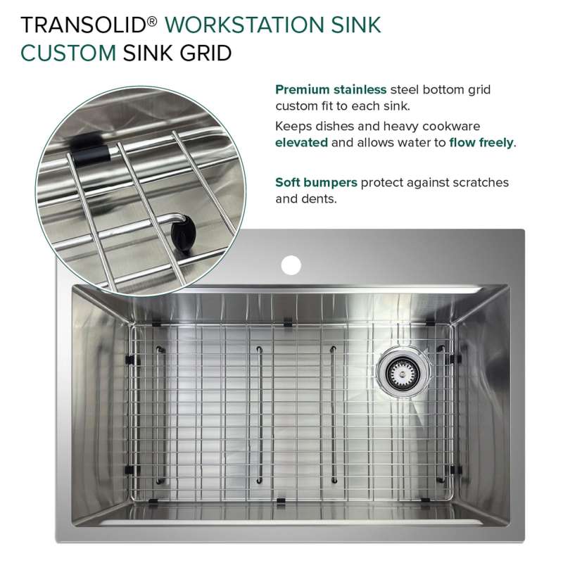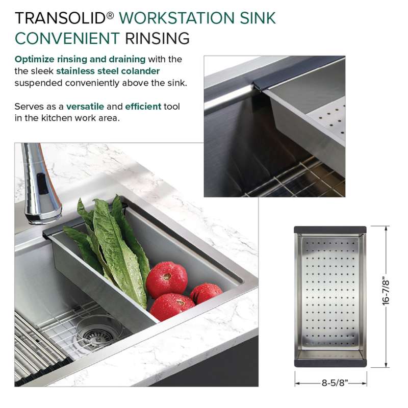 Transolid Kitchen Workstation Sinks redefine culinary convenience. This all-in-one solution includes a sink crafted from 18-gauge 304 stainless steel with a premium brushed finish and custom-fitted accessories. Its clever design optimizes sink space with a ledge for the colander, roller mat, and cutting board. Enjoy a quiet culinary experience thanks to the 5mm sound deadening pads. Let Transolid economically elevate your kitchen with efficiency and style.