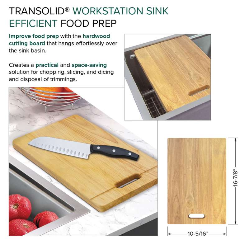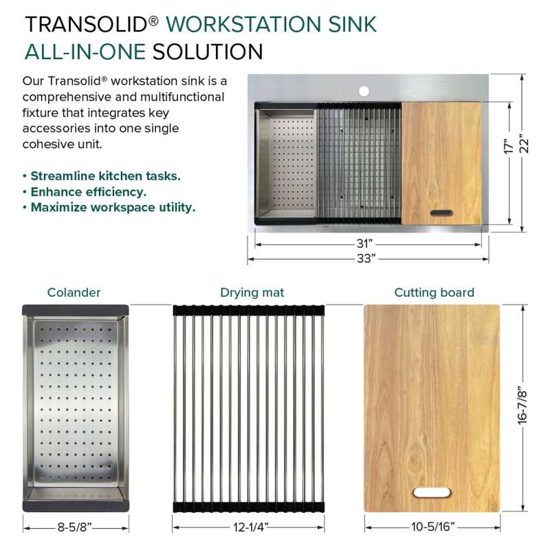 Transolid Kitchen Workstation Sinks redefine culinary convenience. This all-in-one solution includes a sink crafted from 18-gauge 304 stainless steel with a premium brushed finish and custom-fitted accessories. Its clever design optimizes sink space with a ledge for the colander, roller mat, and cutting board. Enjoy a quiet culinary experience thanks to the 5mm sound deadening pads. Let Transolid economically elevate your kitchen with efficiency and style.