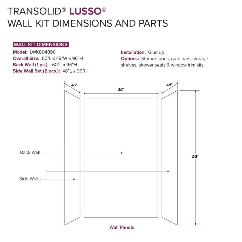 • LWK604896-190 Lusso 60-in x 48-in x 96-in Glue to Wall 3-Piece Shower Wall Kit, Bellanca Bellanca