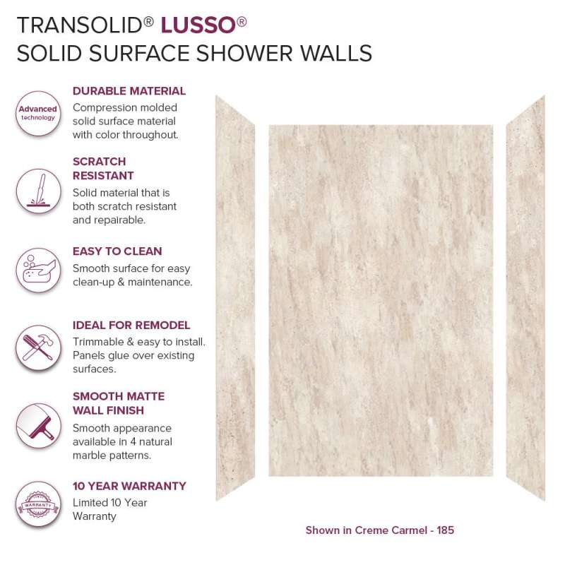 Elevate your bathroom with the sophisticated elegance of Transolid’s Lusso™ shower walls—a high-end solution designed to impress. Featuring exclusive, designer-inspired patterns, these walls offer a luxurious aesthetic that transforms any space into a spa-like retreat. Made from 100% solid surface material, Lusso™ delivers exceptional strength, durability, and scratch resistance, all while being water-resistant and incredibly easy to maintain—just wipe clean with a damp cloth and mild soap. Perfect for both quick remodels and new construction, the lightweight, trimmable panels install effortlessly over existing surfaces, blending refined style with everyday practicality.