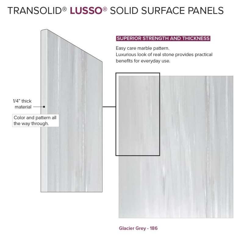 Elevate your bathroom with the sophisticated elegance of Transolid’s Lusso™ shower walls—a high-end solution designed to impress. Featuring exclusive, designer-inspired patterns, these walls offer a luxurious aesthetic that transforms any space into a spa-like retreat. Made from 100% solid surface material, Lusso™ delivers exceptional strength, durability, and scratch resistance, all while being water-resistant and incredibly easy to maintain—just wipe clean with a damp cloth and mild soap. Perfect for both quick remodels and new construction, the lightweight, trimmable panels install effortlessly over existing surfaces, blending refined style with everyday practicality.