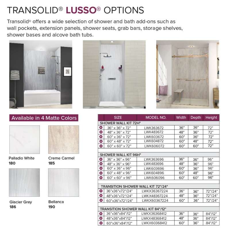 • LWKX60367224-190 Lusso 60-in x 36-in x 72/24-in Glue To Wall 6-Piece Transition Shower Wall Kit, Bellanca Bellanca