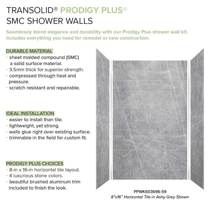 Elevate your bathroom design with Tran solid's Tile-Pattern Prodigy Plus Shower Walls—the ultimate combination of style, durability, and convenience. Crafted with precision and built to last, Prodigy Plus brings a touch of luxury to your shower with a stunning luxurious Stone Color, transforming your space into a serene, high-end retreat. Designed for a custom fit, the trimmable panels ensure a perfect installation in any shower, whether you're a DIY enthusiast or a professional. Easy to install and even easier to maintain, Prodigy Plus features a smooth, non-porous surface that resists stains and mold. Plus, with a hassle-free 10-year limited warranty, you can enjoy long-lasting quality and peace of mind for years to come.