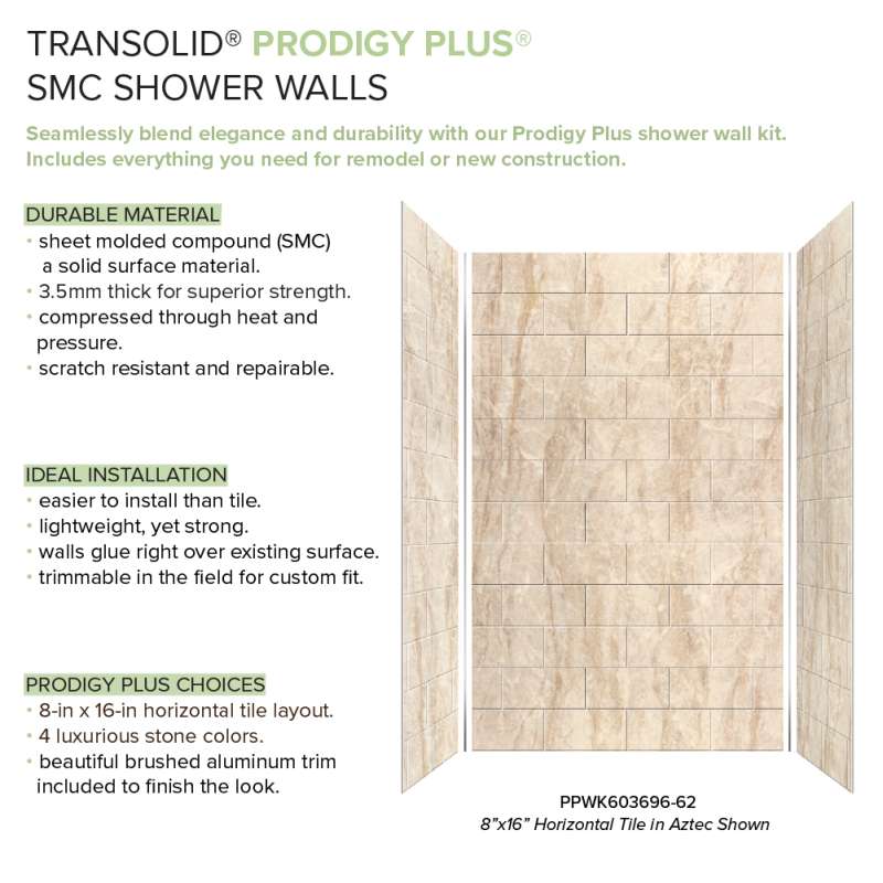Elevate your bathroom design with Tran solid's Tile-Pattern Prodigy Plus Shower Walls—the ultimate combination of style, durability, and convenience. Crafted with precision and built to last, Prodigy Plus brings a touch of luxury to your shower with a stunning luxurious Stone Color, transforming your space into a serene, high-end retreat. Designed for a custom fit, the trimmable panels ensure a perfect installation in any shower, whether you're a DIY enthusiast or a professional. Easy to install and even easier to maintain, Prodigy Plus features a smooth, non-porous surface that resists stains and mold. Plus, with a hassle-free 10-year limited warranty, you can enjoy long-lasting quality and peace of mind for years to come.