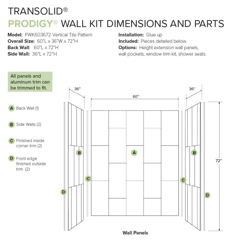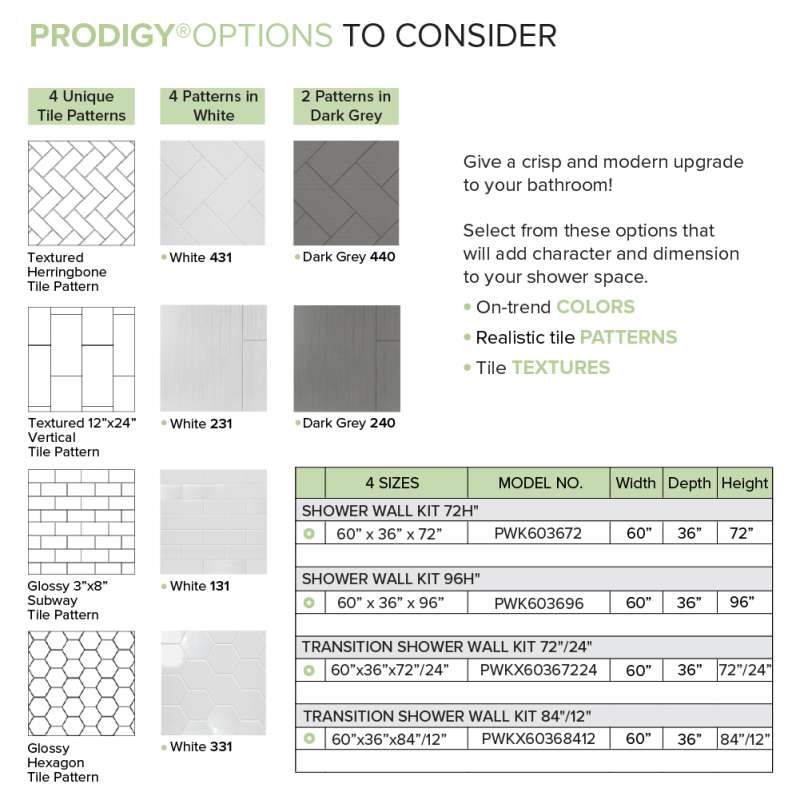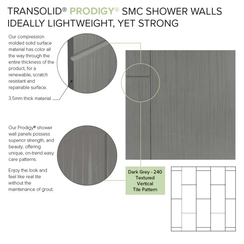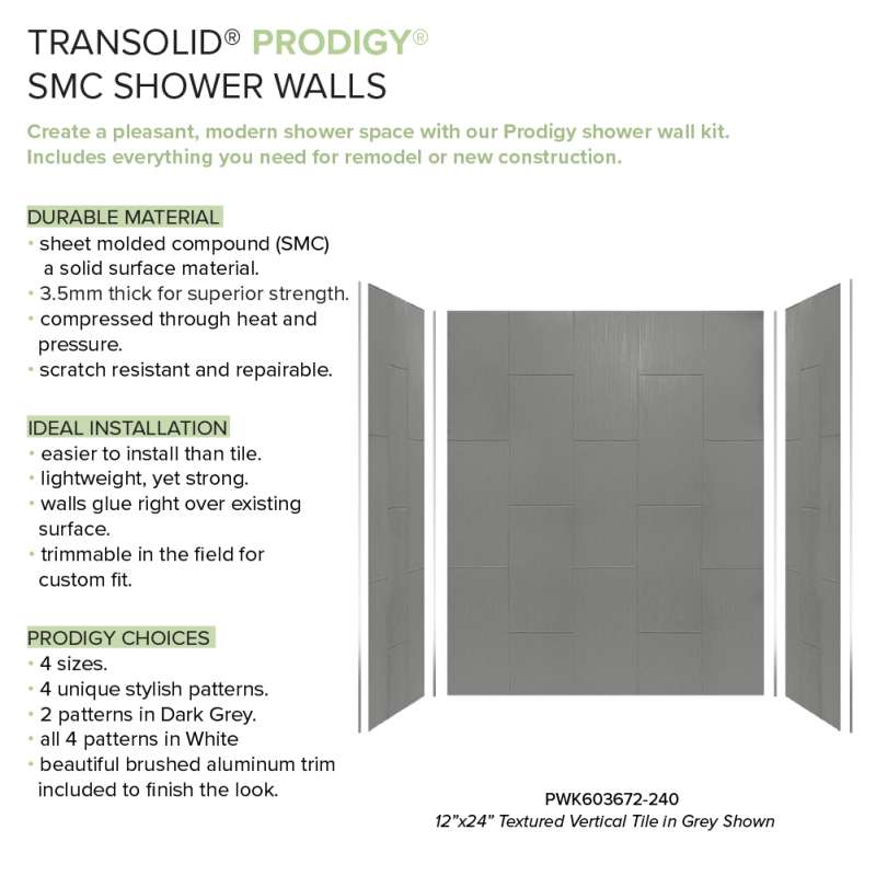 Tile patterns are a classic staple for design, and Transolid is staying current with their trending tile pattern wall offering - all without the mess of grout. Prodigy walls are simply glued over any existing surface, making them perfect for any remodel project with no messy demolition or install required! These shower walls are hygienic, durable, stain resistant, easy to clean, and are ideal for both new and existing construction. Trimmable to fit any job, they can be used for showers with windows or those with tapered walls. All Transolid shower walls are backed by a hassle-free 10-year limited warranty. Transolid is confident these trendy bathroom wall panels are the right choice for your project!