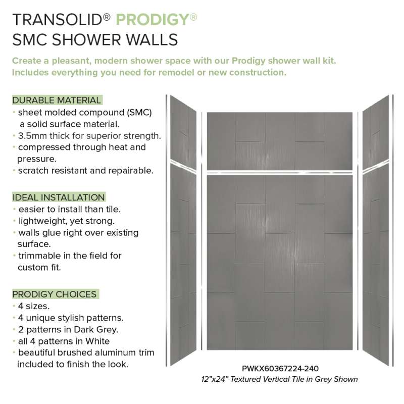 Tile patterns are a classic staple for design, and Transolid is staying current with their trending tile pattern wall offering - all without the mess of grout. Prodigy walls are simply glued over any existing surface, making them perfect for any remodel project with no messy demolition or install required! These shower walls are hygienic, durable, stain resistant, easy to clean, and are ideal for both new and existing construction. Trimmable to fit any job, they can be used for showers with windows or those with tapered walls. All Transolid shower walls are backed by a hassle-free 10-year limited warranty. Transolid is confident these trendy bathroom wall panels are the right choice for your project!