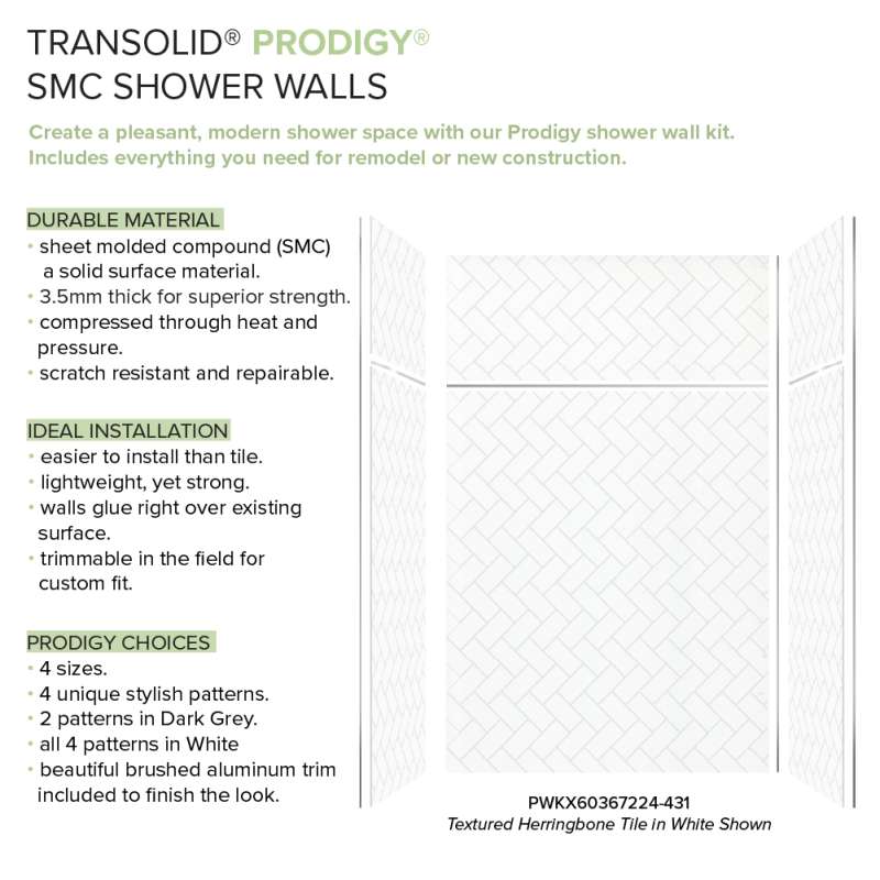 Tile patterns are a classic staple for design, and Transolid is staying current with their trending tile pattern wall offering - all without the mess of grout. Prodigy walls are simply glued over any existing surface, making them perfect for any remodel project with no messy demolition or install required! These shower walls are hygienic, durable, stain resistant, easy to clean, and are ideal for both new and existing construction. Trimmable to fit any job, they can be used for showers with windows or those with tapered walls. All Transolid shower walls are backed by a hassle-free 10-year limited warranty. Transolid is confident these trendy bathroom wall panels are the right choice for your project!
