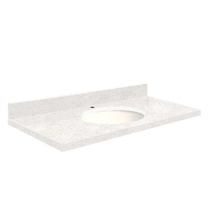 Transolid engineered quartz is produced from 93% quartz under extreme high pressures to yield a top that is hard, stain and heat resistant with a consistent color throughout. Transolid quartz tops never need sealing, polishing or reconditioning and are practically care-free. They are exceptionally hard, making them resistant to cracks, chips, scratches and stains for years of trouble-free beauty. All include an undermount oval china bowl and 4-in loose backsplash.