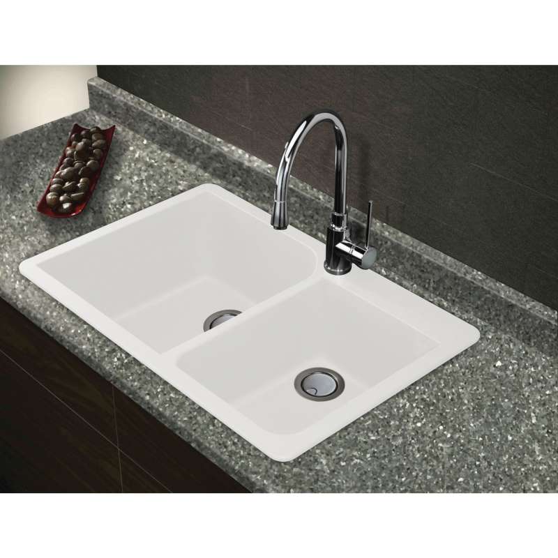33-in x 22-in x 9.5-in silQ Granite Kitchen Sink with 1-3/4 Double Offset Bowls, Drop-in Installation, with 1 Pre-Drilled Faucet Hole, in White White