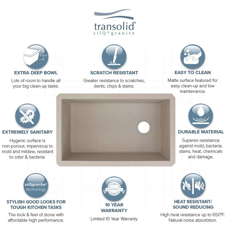 Transolid silQ-granite sinks combine good looks, durability, and non-fading colors. With extra deep bowls, you have more room inside for stacking dishes, filling stock pots, and handling large baking sheets and roasters. Material has sound-deadening qualities which minimize sound and vibrations for quieter performance. When you choose a beautiful Transolid granite kitchen sink, it will transform your kitchen at an affordable price with great value and style comparable to leading brands like Elkay, Swan, Blanco, and Kraus.