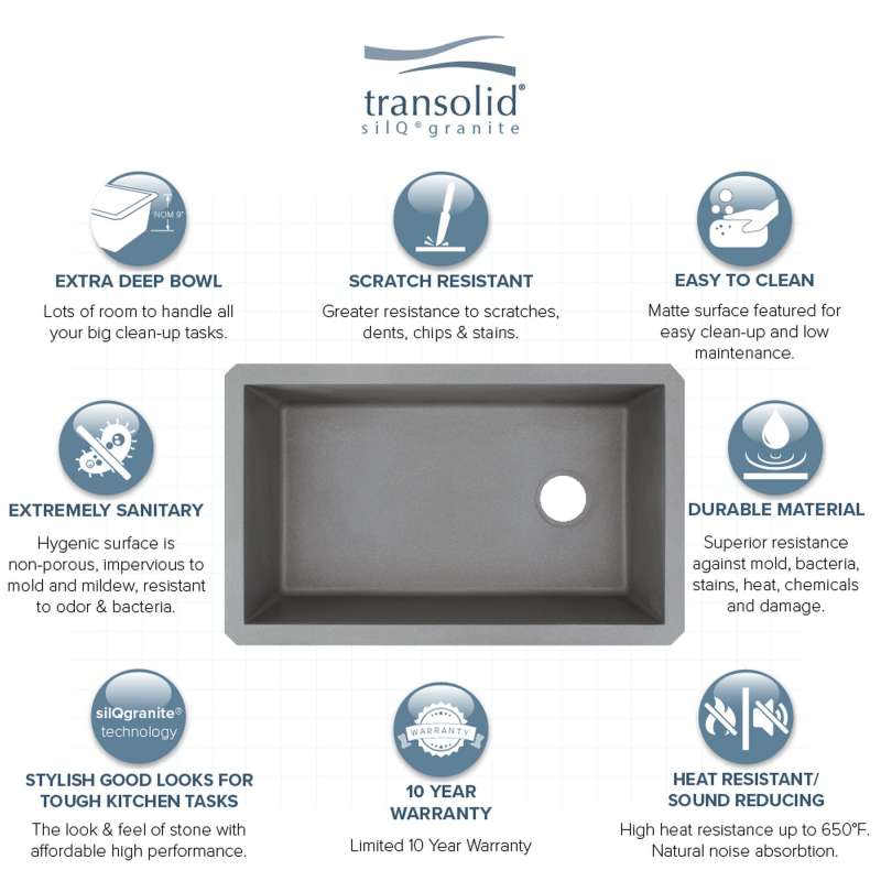Transolid silQ-granite sinks combine good looks, durability, and non-fading colors. With extra deep bowls, you have more room inside for stacking dishes, filling stock pots, and handling large baking sheets and roasters. Material has sound-deadening qualities which minimize sound and vibrations for quieter performance. When you choose a beautiful Transolid granite kitchen sink, it will transform your kitchen at an affordable price with great value and style comparable to leading brands like Elkay, Swan, Blanco, and Kraus.