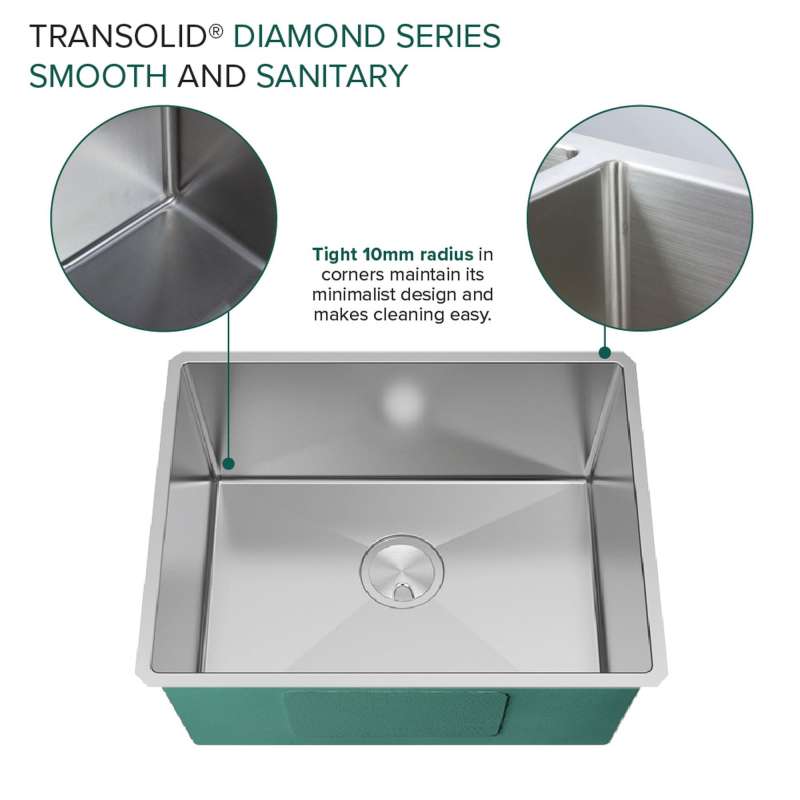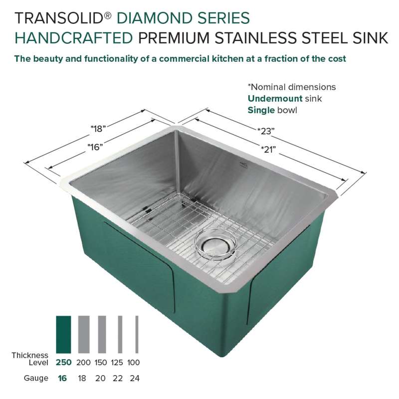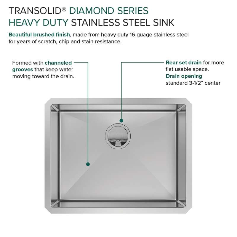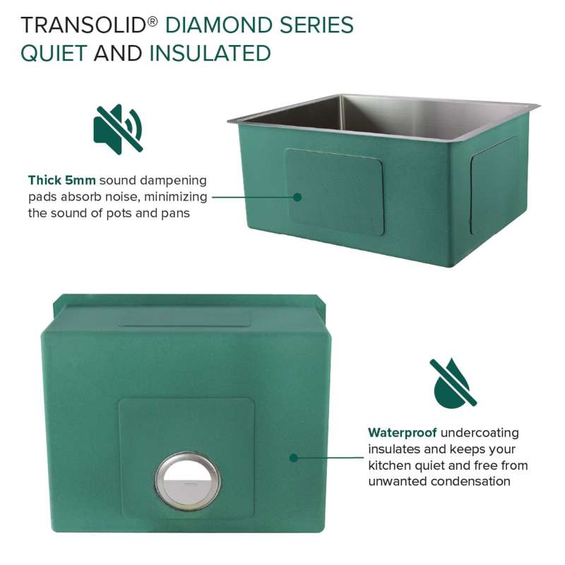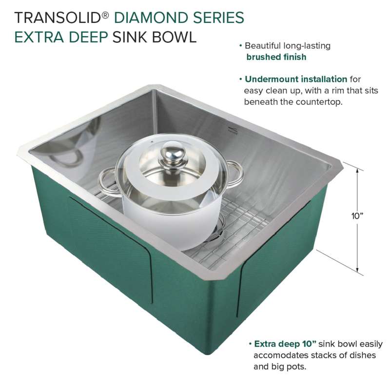 With the Transolid Diamond Sink Collection you can experience the beauty and functionality of a commercial kitchen at a fraction of the cost. Crafted from industrial 304 stainless steel with substantial 16-gauge thickness, which is 2.5 times heavier than similar size sinks available in the market, these luxurious sinks are known for their appeal, durability, and corrosion resistance. The deep 10 in. basins feature channeled grooves along the sink bottom and tight 3/8 in. radius interior corners that work to keep the water moving towards the drain. The underside of the sinks include thick 5 mm sound deadening pads and waterproof undercoating to keep your kitchen quiet and free from unwanted condensation. Included with every Transolid Diamond Sink is a universal sink drain kit with standard 1-1/2 inch pipe fittings, a magnetic accessories kit consisting of a hook, ledge, and sponge holder, which can easily adhere to the side of the sink by applying the included magnetic tape along the underside. A matching stainless steel sink grid with rubber bumpers to keep your sink protected from scratches and a sleek stainless covered flip-top sink strainer are also included. The long-lasting brushed finish sink and included accessories will compliment any kitchen and provide a true sense of culinary excellence. Transolid Diamond Sinks are all backed by a lifetime limited warranty.