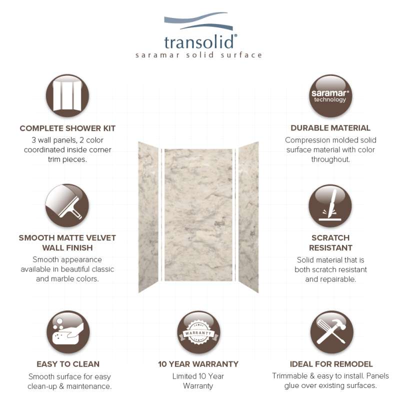 Transolid SaraMar bath and shower wall panels in Velvet finish are characterized by a smooth, matte finish, which offers a unique and modern element that can quickly elevate the design of your bathroom. These walls are ideal for a quick remodel, because there is no messy demolition required, instead, SaraMar walls simply glue right over your existing surface. All Transolid shower walls are backed by a hassle-free 10-year warranty. SaraMar walls are easy-to-clean, durable, and resistant to stain; they work with new and existing construction, they are trimmable to fit any space, and are on trend with the latest colors and patterns. Discover whether these bathroom wall panels are the right choice for you!