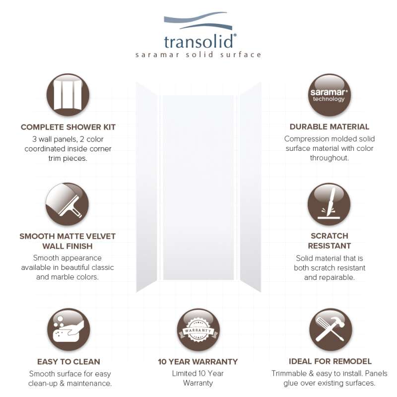 Transolid SaraMar bath and shower wall panels in Velvet finish are characterized by a smooth, matte finish, which offers a unique and modern element that can quickly elevate the design of your bathroom. These walls are ideal for a quick remodel, because there is no messy demolition required, instead, SaraMar walls simply glue right over your existing surface. All Transolid shower walls are backed by a hassle-free 10-year warranty. SaraMar walls are easy-to-clean, durable, and resistant to stain; they work with new and existing construction, they are trimmable to fit any space, and are on trend with the latest colors and patterns. Discover whether these bathroom wall panels are the right choice for you!