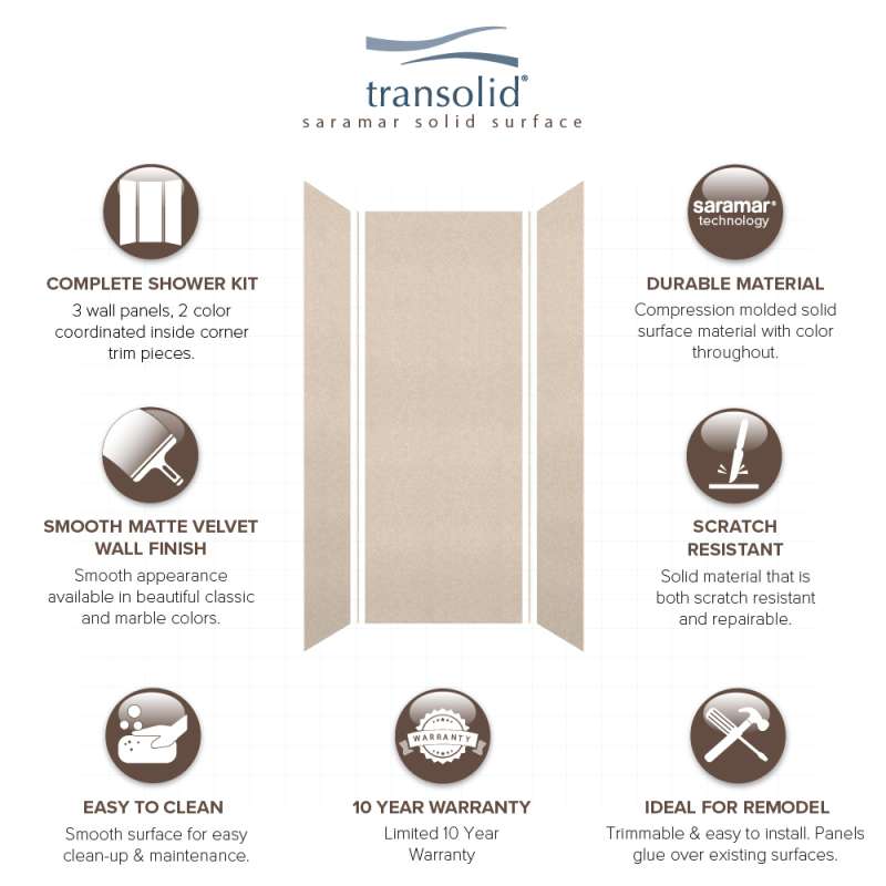 Transolid SaraMar bath and shower wall panels in Velvet finish are characterized by a smooth, matte finish, which offers a unique and modern element that can quickly elevate the design of your bathroom. These walls are ideal for a quick remodel, because there is no messy demolition required, instead, SaraMar walls simply glue right over your existing surface. All Transolid shower walls are backed by a hassle-free 10-year warranty. SaraMar walls are easy-to-clean, durable, and resistant to stain; they work with new and existing construction, they are trimmable to fit any space, and are on trend with the latest colors and patterns. Discover whether these bathroom wall panels are the right choice for you!