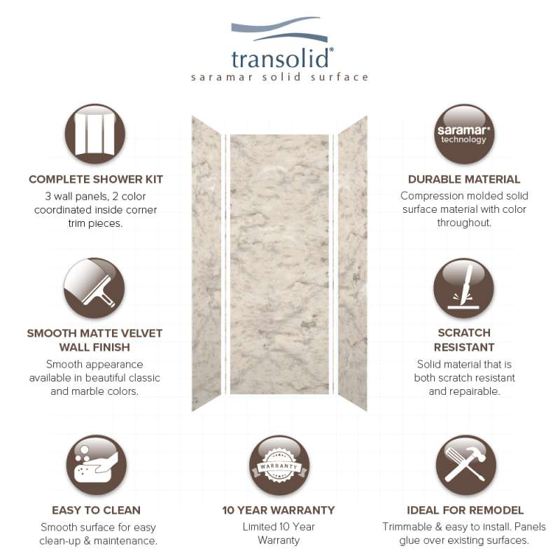 Transolid SaraMar bath and shower wall panels in Velvet finish are characterized by a smooth, matte finish, which offers a unique and modern element that can quickly elevate the design of your bathroom. These walls are ideal for a quick remodel, because there is no messy demolition required, instead, SaraMar walls simply glue right over your existing surface. All Transolid shower walls are backed by a hassle-free 10-year warranty. SaraMar walls are easy-to-clean, durable, and resistant to stain; they work with new and existing construction, they are trimmable to fit any space, and are on trend with the latest colors and patterns. Discover whether these bathroom wall panels are the right choice for you!