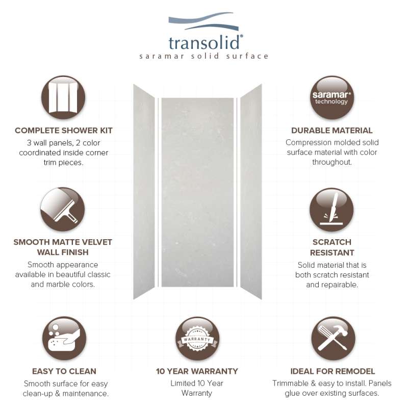 Transolid SaraMar bath and shower wall panels in Velvet finish are characterized by a smooth, matte finish, which offers a unique and modern element that can quickly elevate the design of your bathroom. These walls are ideal for a quick remodel, because there is no messy demolition required, instead, SaraMar walls simply glue right over your existing surface. All Transolid shower walls are backed by a hassle-free 10-year warranty. SaraMar walls are easy-to-clean, durable, and resistant to stain; they work with new and existing construction, they are trimmable to fit any space, and are on trend with the latest colors and patterns. Discover whether these bathroom wall panels are the right choice for you!