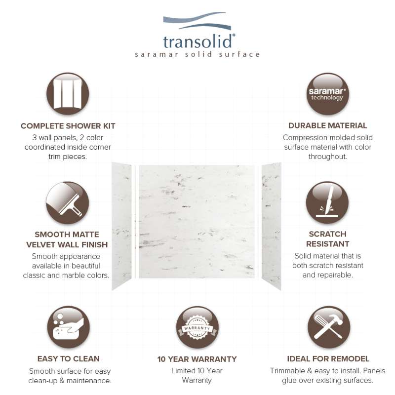 Transolid SaraMar bath and shower wall panels in Velvet finish are characterized by a smooth, matte finish, which offers a unique and modern element that can quickly elevate the design of your bathroom. These walls are ideal for a quick remodel, because there is no messy demolition required, instead, SaraMar walls simply glue right over your existing surface. All Transolid shower walls are backed by a hassle-free 10-year warranty. SaraMar walls are easy-to-clean, durable, and resistant to stain; they work with new and existing construction, they are trimmable to fit any space, and are on trend with the latest colors and patterns. Discover whether these bathroom wall panels are the right choice for you!