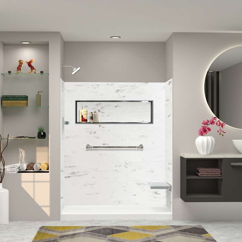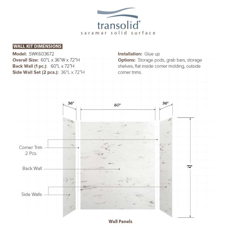 • SWK603672-47V SaraMar 60-in x 36-in x 72-in Glue to Wall 3-Piece Shower Wall Trimmable Kit, White Venito Velvet White Venito Velvet