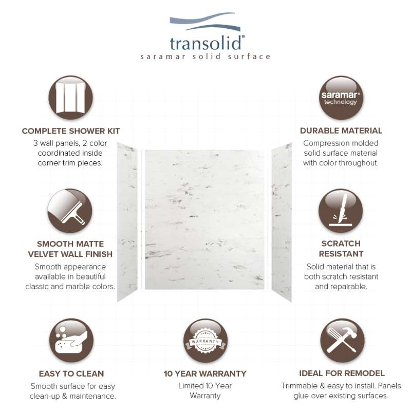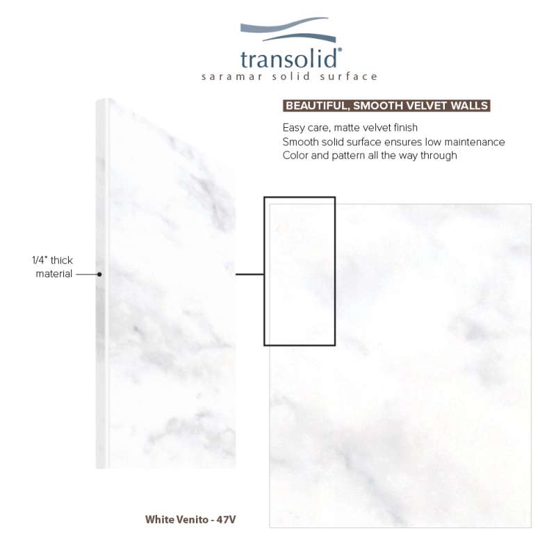 Transolid SaraMar bath and shower wall panels in Velvet finish are characterized by a smooth, matte finish, which offers a unique and modern element that can quickly elevate the design of your bathroom. These walls are ideal for a quick remodel, because there is no messy demolition required, instead, SaraMar walls simply glue right over your existing surface. All Transolid shower walls are backed by a hassle-free 10-year warranty. SaraMar walls are easy-to-clean, durable, and resistant to stain; they work with new and existing construction, they are trimmable to fit any space, and are on trend with the latest colors and patterns. Discover whether these bathroom wall panels are the right choice for you!