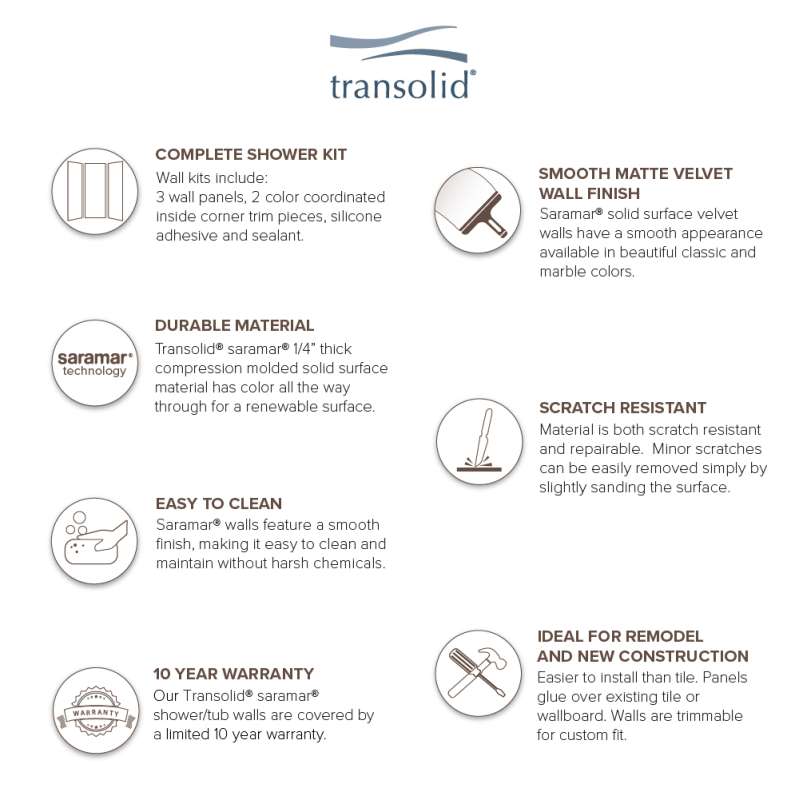 Transolid SaraMar bath and shower wall panels in Velvet finish are characterized by a smooth, matte finish, which offers a unique and modern element that can quickly elevate the design of your bathroom. These walls are ideal for a quick remodel, because there is no messy demolition required, instead, SaraMar walls simply glue right over your existing surface. All Transolid shower walls are backed by a hassle-free 10-year warranty. SaraMar walls are easy-to-clean, durable, and resistant to stain; they work with new and existing construction, they are trimmable to fit any space, and are on trend with the latest colors and patterns. Discover whether these bathroom wall panels are the right choice for you!