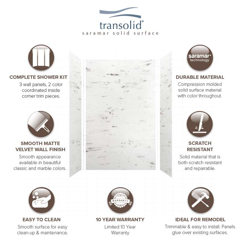 Transolid SaraMar bath and shower wall panels in Velvet finish are characterized by a smooth, matte finish, which offers a unique and modern element that can quickly elevate the design of your bathroom. These walls are ideal for a quick remodel, because there is no messy demolition required, instead, SaraMar walls simply glue right over your existing surface. All Transolid shower walls are backed by a hassle-free 10-year warranty. SaraMar walls are easy-to-clean, durable, and resistant to stain; they work with new and existing construction, they are trimmable to fit any space, and are on trend with the latest colors and patterns. Discover whether these bathroom wall panels are the right choice for you!
