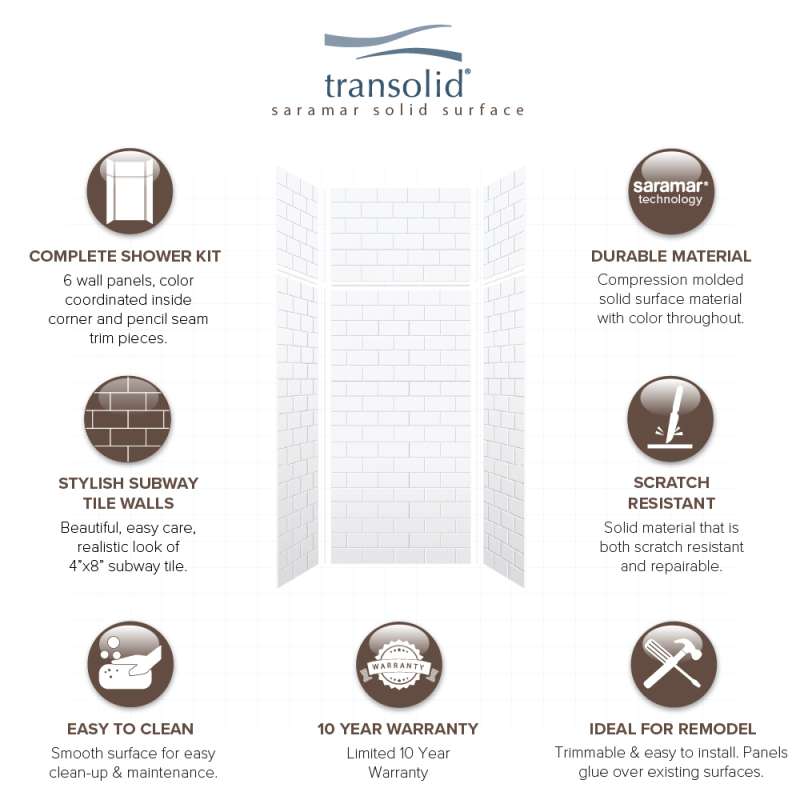 Subway tile has become a staple for design and Transolid is staying current with this trend by offering the SaraMar bath and shower wall panels. Subway tile offers a classic element that can elevate the design of any room; however, it’s clean and bright characteristics really appeal to a bathroom. These walls are ideal for a quick remodel, because there is no messy demolition required, instead, SaraMar walls simply glue right over your existing surface. All Transolid shower walls are backed by a hassle-free 10-year warranty. SaraMar walls are easy-to-clean, durable, and resistant to stain; they work with new and existing construction, they are trimmable to fit any space, and are on trend with the latest colors and patterns. Discover whether these bathroom wall panels are the right choice for you!