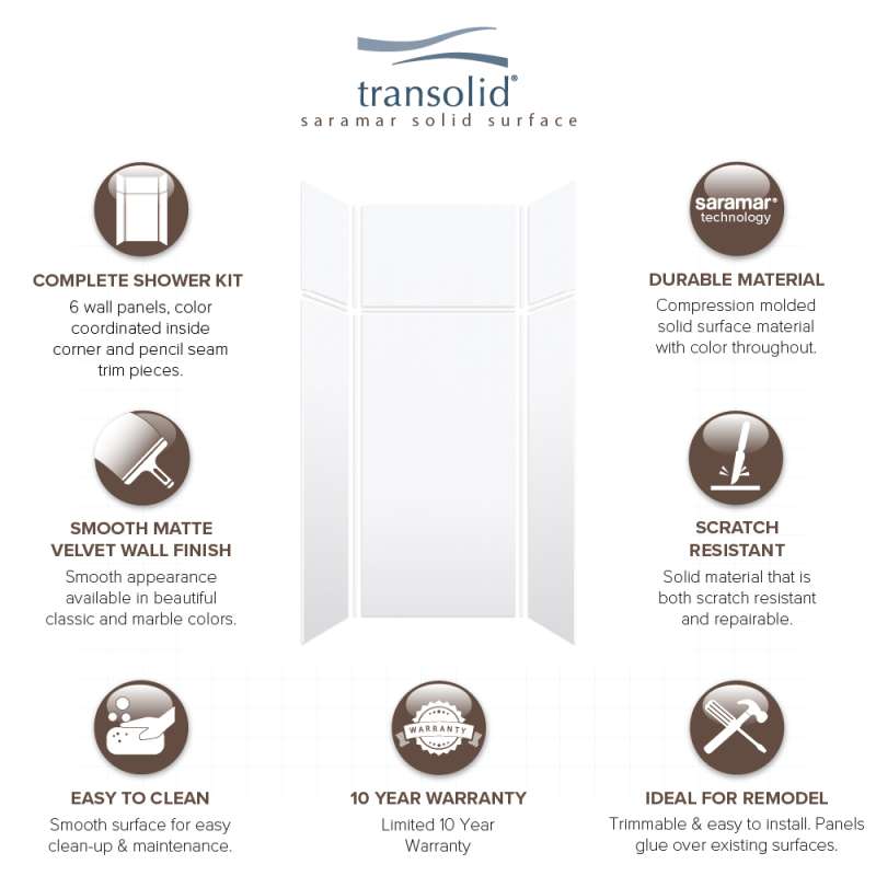 Transolid SaraMar bath and shower wall panels in Velvet finish are characterized by a smooth, matte finish, which offers a unique and modern element that can quickly elevate the design of your bathroom. These walls are ideal for a quick remodel, because there is no messy demolition required, instead, SaraMar walls simply glue right over your existing surface. All Transolid shower walls are backed by a hassle-free 10-year warranty. SaraMar walls are easy-to-clean, durable, and resistant to stain; they work with new and existing construction, they are trimmable to fit any space, and are on trend with the latest colors and patterns. Discover whether these bathroom wall panels are the right choice for you!