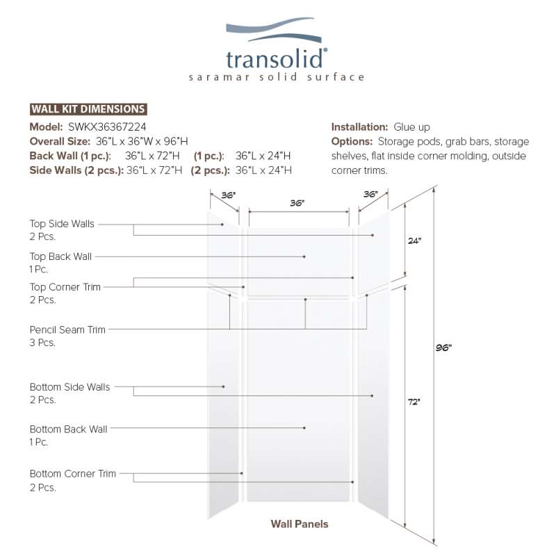 • SWKX36367224-50V SaraMar 36-in x 36-in x 96-in Glue to Wall 6-Piece Shower Wall Trimmable Kit with Extension, Lunar Velvet Lunar Velvet