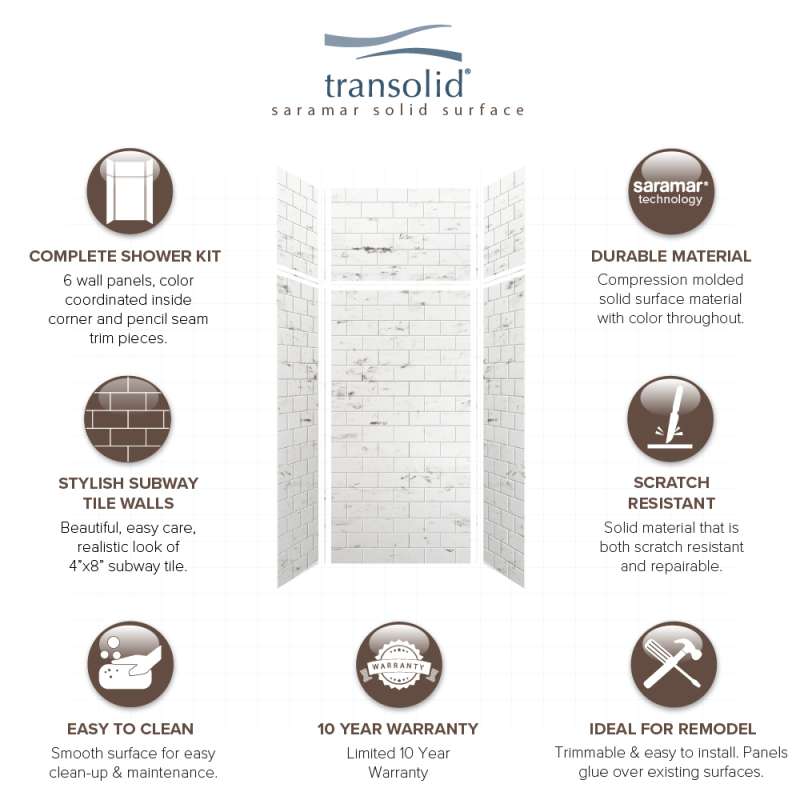 Subway tile has become a staple for design and Transolid is staying current with this trend by offering the SaraMar bath and shower wall panels. Subway tile offers a classic element that can elevate the design of any room; however, it’s clean and bright characteristics really appeal to a bathroom. These walls are ideal for a quick remodel, because there is no messy demolition required, instead, SaraMar walls simply glue right over your existing surface. All Transolid shower walls are backed by a hassle-free 10-year warranty. SaraMar walls are easy-to-clean, durable, and resistant to stain; they work with new and existing construction, they are trimmable to fit any space, and are on trend with the latest colors and patterns. Discover whether these bathroom wall panels are the right choice for you!