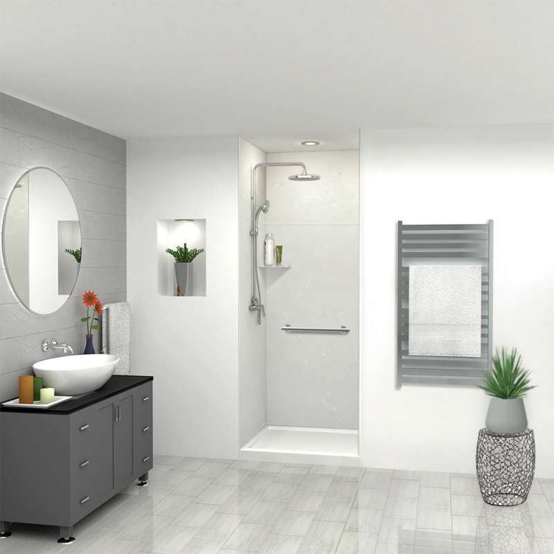 • SWKX36367224-21V SaraMar 36-in x 36-in x 96-in Glue to Wall 6-Piece Shower Wall Trimmable Kit with Extension, White Velvet White Velvet