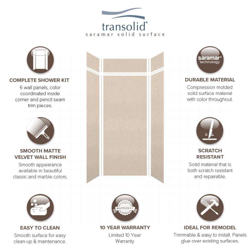Transolid SaraMar bath and shower wall panels in Velvet finish are characterized by a smooth, matte finish, which offers a unique and modern element that can quickly elevate the design of your bathroom. These walls are ideal for a quick remodel, because there is no messy demolition required, instead, SaraMar walls simply glue right over your existing surface. All Transolid shower walls are backed by a hassle-free 10-year warranty. SaraMar walls are easy-to-clean, durable, and resistant to stain; they work with new and existing construction, they are trimmable to fit any space, and are on trend with the latest colors and patterns. Discover whether these bathroom wall panels are the right choice for you!
