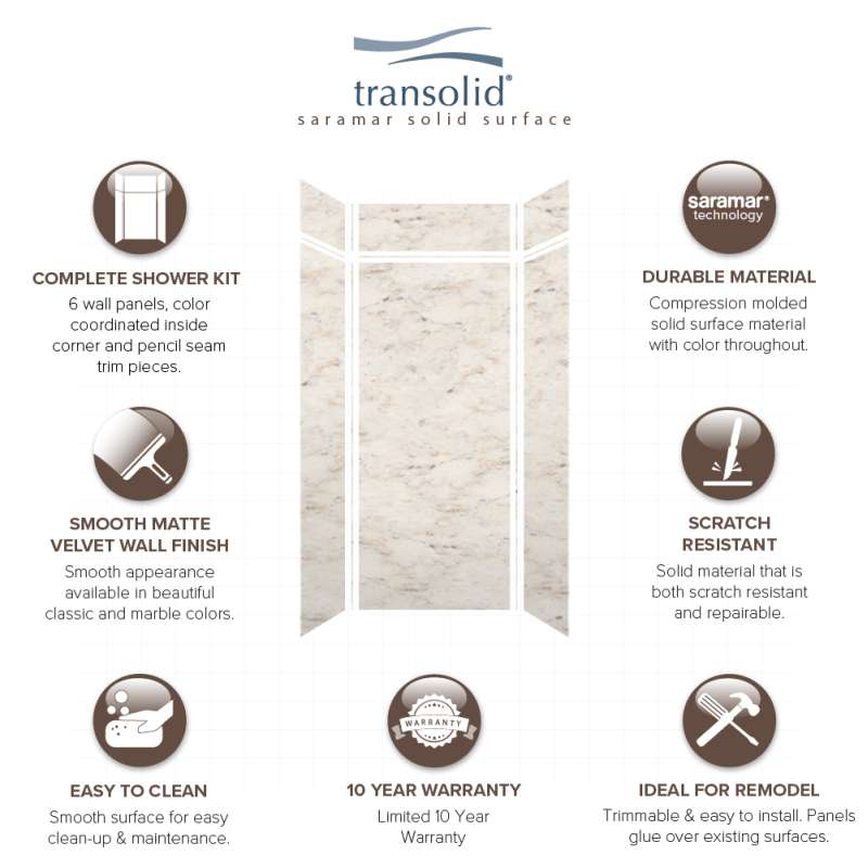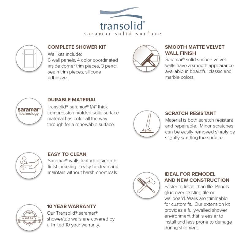 Transolid SaraMar bath and shower wall panels in Velvet finish are characterized by a smooth, matte finish, which offers a unique and modern element that can quickly elevate the design of your bathroom. These walls are ideal for a quick remodel, because there is no messy demolition required, instead, SaraMar walls simply glue right over your existing surface. All Transolid shower walls are backed by a hassle-free 10-year warranty. SaraMar walls are easy-to-clean, durable, and resistant to stain; they work with new and existing construction, they are trimmable to fit any space, and are on trend with the latest colors and patterns. Discover whether these bathroom wall panels are the right choice for you!
