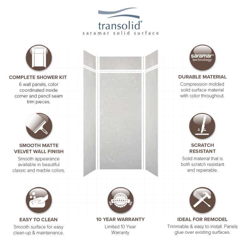 Transolid SaraMar bath and shower wall panels in Velvet finish are characterized by a smooth, matte finish, which offers a unique and modern element that can quickly elevate the design of your bathroom. These walls are ideal for a quick remodel, because there is no messy demolition required, instead, SaraMar walls simply glue right over your existing surface. All Transolid shower walls are backed by a hassle-free 10-year warranty. SaraMar walls are easy-to-clean, durable, and resistant to stain; they work with new and existing construction, they are trimmable to fit any space, and are on trend with the latest colors and patterns. Discover whether these bathroom wall panels are the right choice for you!