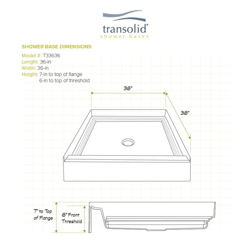 Transolid T3 shower bases are made from an engineered compound material composed of resin, glass, and special fillers formed into sheets. Sheets are placed under extreme pressure and heat to form precise radius and angle. It is strong, lightweight, slip resistant and scratch resistant. Pre-leveled single threshold base with strong structural ribs for easy installation, making it perfect for both new and existing construction. Made in the USA.