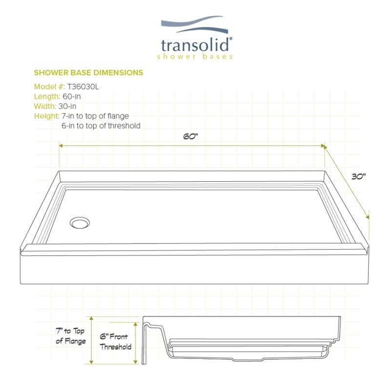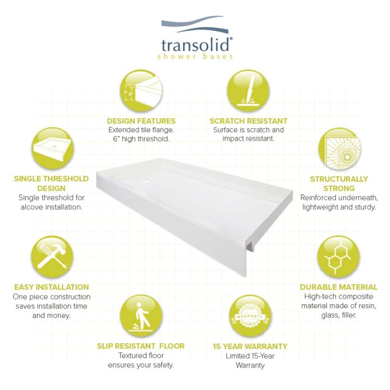 Transolid T3 shower bases are made from an engineered compound material composed of resin, glass, and special fillers formed into sheets. Sheets are placed under extreme pressure and heat to form precise radius and angle. It is strong, lightweight, slip resistant and scratch resistant. Pre-leveled single threshold base with strong structural ribs for easy installation, making it perfect for both new and existing construction. Made in the USA.