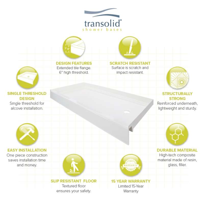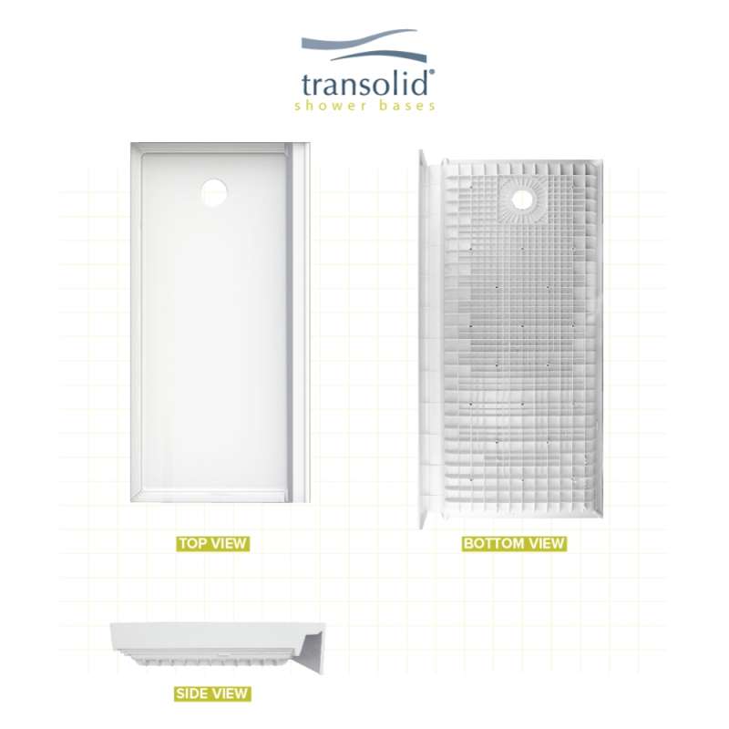 Transolid T3 shower bases are made from an engineered compound material composed of resin, glass, and special fillers formed into sheets. Sheets are placed under extreme pressure and heat to form precise radius and angle. It is strong, lightweight, slip resistant and scratch resistant. Pre-leveled single threshold base with strong structural ribs for easy installation, making it perfect for both new and existing construction. Made in the USA.