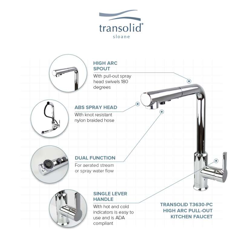 You're the master chef in your kitchen, so your faucet should be equal to the task. Transolid kitchen faucets incorporate innovative design with quality brass construction. The high-arc swivel spout is able to reach every corner of the sink, allowing you to fill and clean even your largest pots with ease. Transolid backs every kitchen faucet with a hassle-free, lifetime limited warranty.