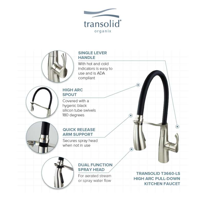 You're the master chef in your kitchen, so your faucet should be equal to the task. Transolid kitchen faucets incorporate innovative design with quality brass construction. The high-arc swivel spout is able to reach every corner of the sink, allowing you to fill and clean even your largest pots with ease. Transolid backs every kitchen faucet with a hassle-free, lifetime limited warranty.