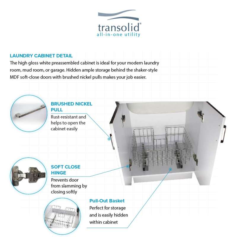 The Transolid TCAB-2420-WC Laundry Cabinet combines beauty and convenience with its all-in-one functionality, featuring a pre-built shaker style cabinet with a sturdy pull-out basket, a spacious handmade stainless steel sink, and a multi-function faucet. The uniquely designed laundry/utility sink cabinet integrates seamlessly into many spaces, with its classic finishing look and durable components, offering ease of convenience, specifically for a laundry room, workshop, basement, or garage. Transolid offers a hassle-free 1-year limited warranty.