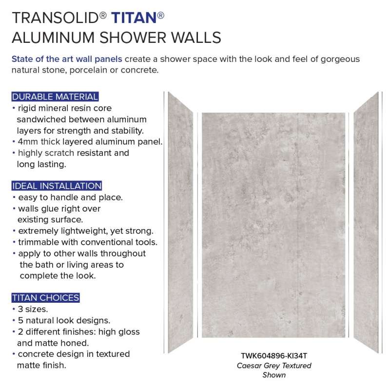 Perfect for new construction or a refreshing remodel, Transolid Titan Shower Walls add a luxurious natural stone look to any area of your home. Customize your space by using our versatile walls in your shower, bathroom, or laundry room, as accent pieces, or as kitchen backsplash. Make your design dreams come true without the hassle; these lightweight walls glue right over existing surfaces for a quick and easy installation. Choose Transolid and let the easy to clean, water and scratch resistant walls simplify your life for years to come.